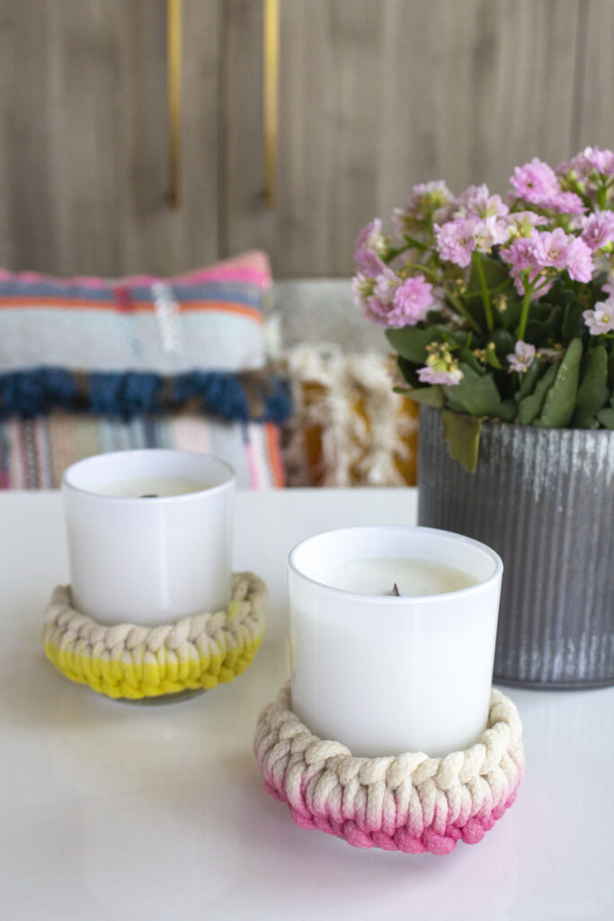 Create a fun candle cozy that can be used over and over again. You can braid or crochet it together to fit your specific candle jar. You can purchase a cord at a local craft store or from an online vendor. Why not kick it up a notch and dip dye your candle cozy? It will add personality and style to your candle display. Below are the ones we dip dyed recently. These make for a great home decor enhancement to any candle.